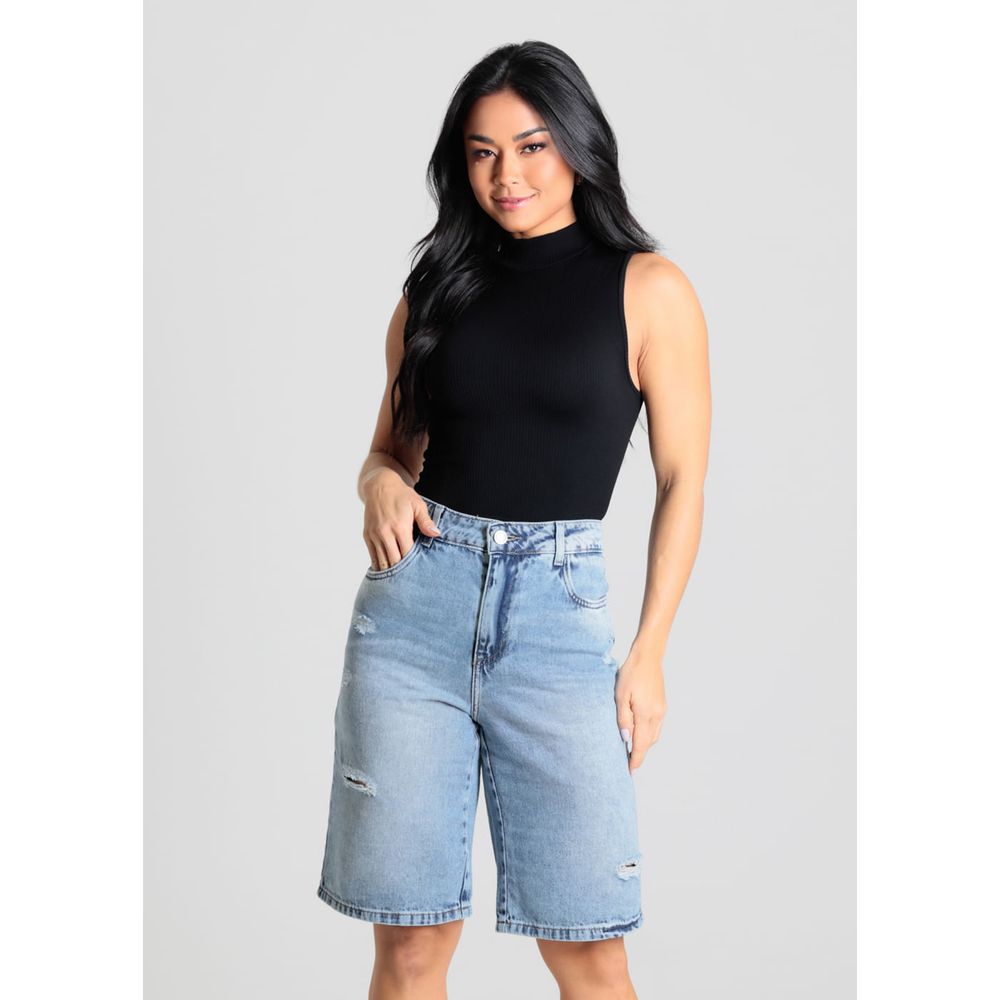 Bermuda confeccionado em jeans. Modelagem moderna e confortável para todas as ocasiões. Cintura alta Fechamento com botão e zíper Bolsos frontais falsos e posterior funcionais Barra simples Tecido: Jeans Tipo de lavagem: Azul Cor: Azul media