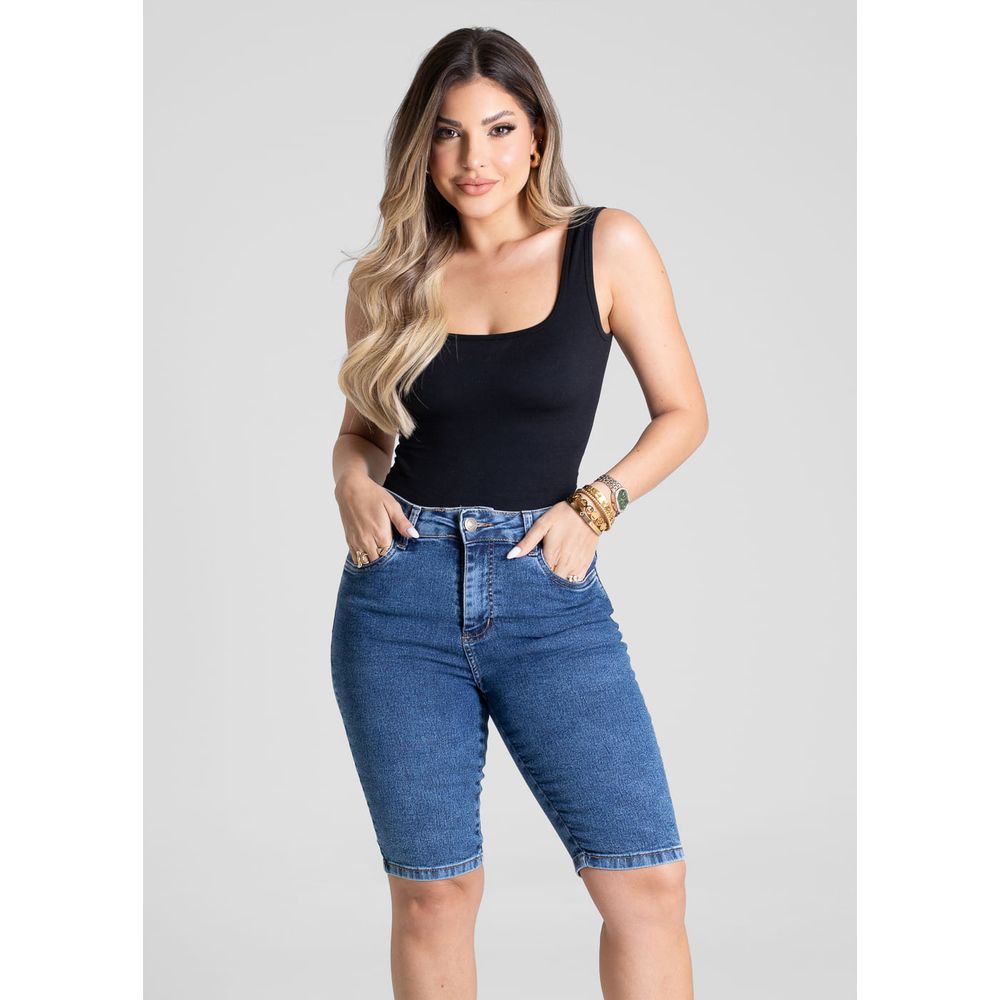 Bermuda confeccionado em jeans. Modelagem moderna e confortável para todas as ocasiões. Cintura alta Fechamento com botão e zíper Bolsos frontais faca posterior funcionais Barra simples Tecido: Jeans Tipo de lavagem: Azul Cor: Azul médio