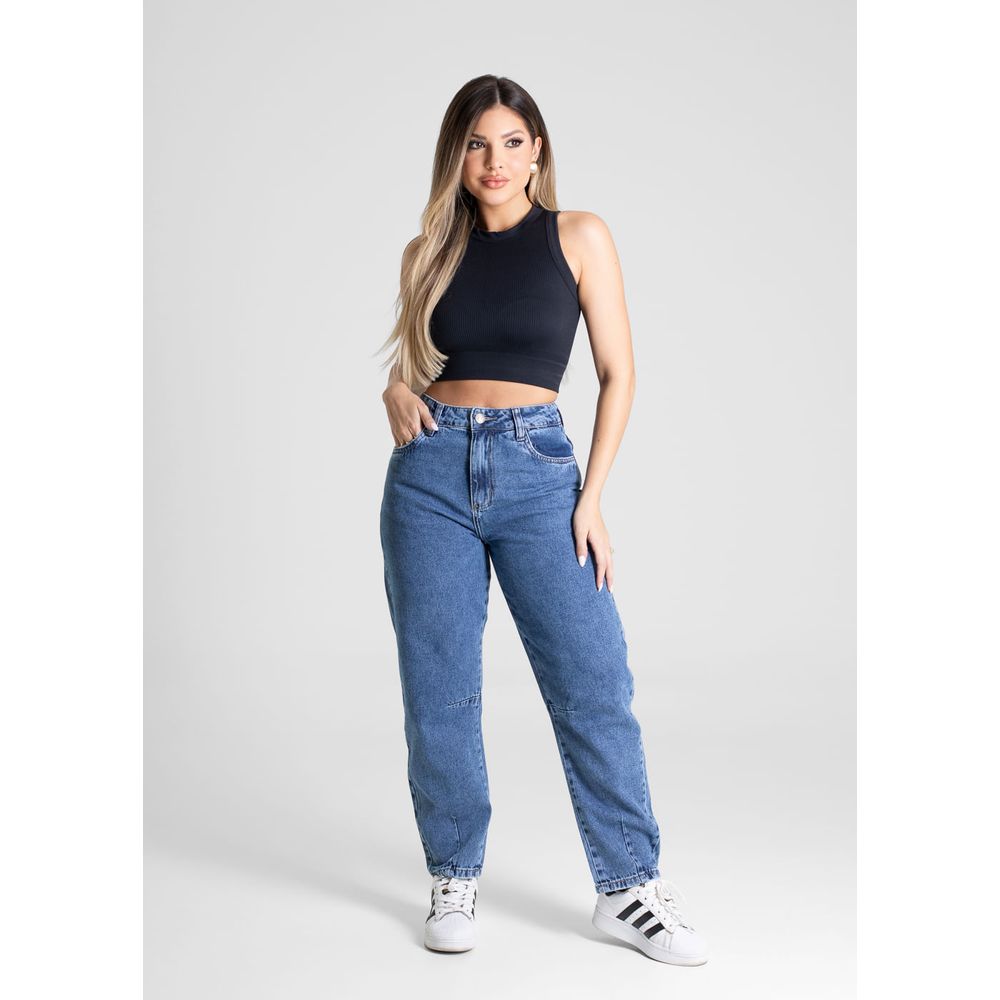 Calça feminina confeccionada em jeans. A peça tem a modelagem barrel, com o caimento é confortavel solto ao corpo. Cintura alta Fechamento através de um botão e zíper Bolsos frontais e posteriores funcionais Barra simples Tecido: Jeans Tipo de Lavagem: azul Cor: Azul