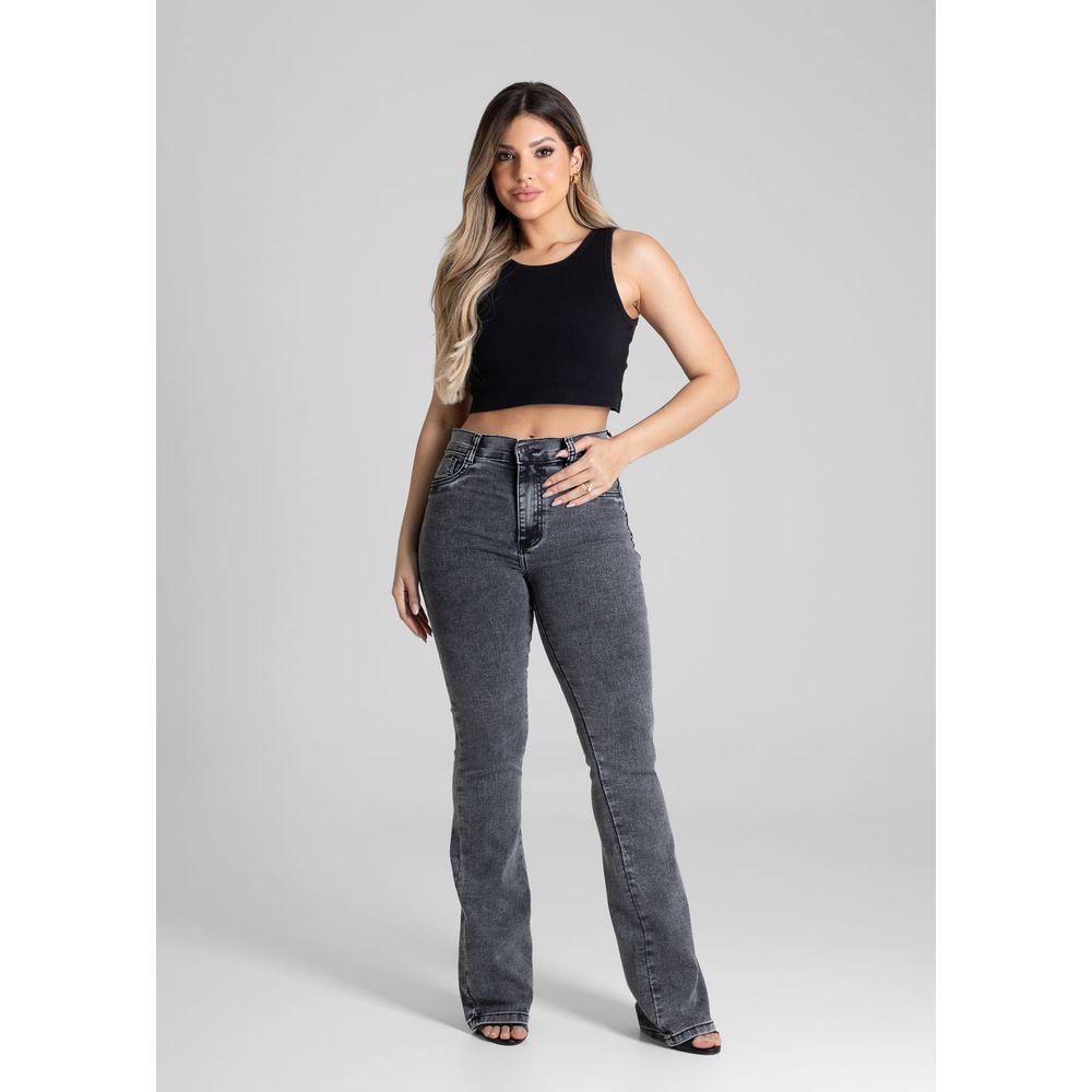 A modelagem boot cut tem o caimento ajustado nas pernas e levemente ampla barra. Cintura media Fechamento com botão e zíper Bolsos frontais falsos e posteriores funcionais Barra simples Modelagem: boot cut Tecido: Jeans Tipo de lavagem: marmorizada Cor: preta