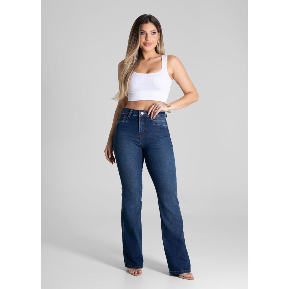 A modelagem boot cut tem o caimento ajustado nas pernas e levemente ampla barra. Cintura media Fechamento com botão e zíper Bolsos frontais falsos e posteriores funcionais Barra simples Modelagem: boot cut Tecido: Jeans Tipo de lavagem: Azul Cor: Azul médio