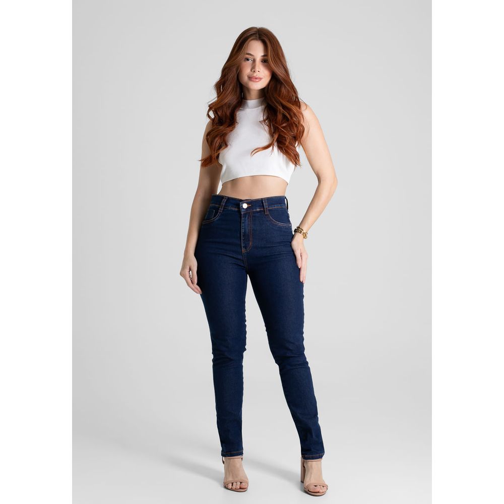 Calça hot pants confeccionada em jeans. Cintura alta Fechamento com botão e zíper Bolsos frontais falsos e bolsos traseiros funcionais Barra simples Modelagem: Hot pants Tecido: Jeans Tipo de lavagem: Azul Cor: Azul medio