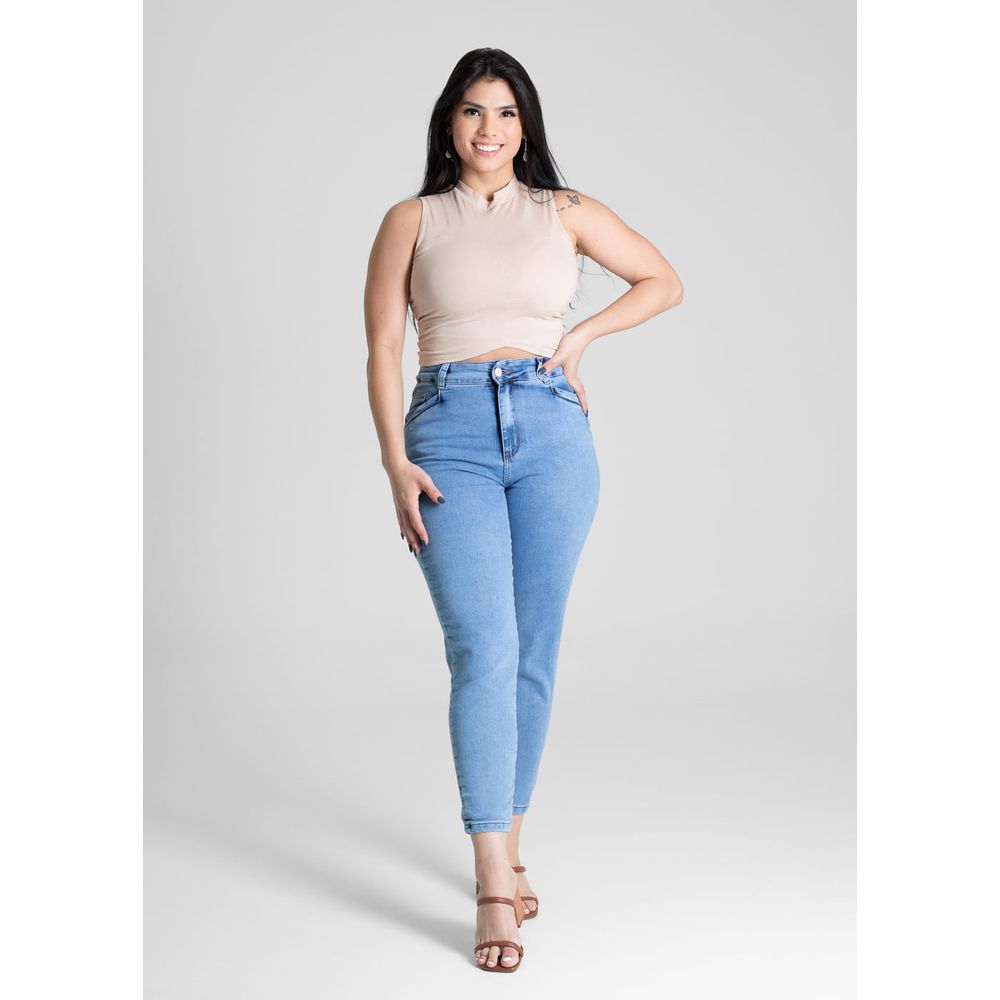 Calça mom confeccionada em jeans. A modelagem mom tem um caimento soltinho nos quadris e coxas ajustando até o tornozelo. Cintura alta Fechamento com botão e zíper Bolsos frontais e bolsos traseiros funcionais Barra simples Modelagem: Mom Tecido: Jeans Tipo de lavagem: Azul Cor: Azul