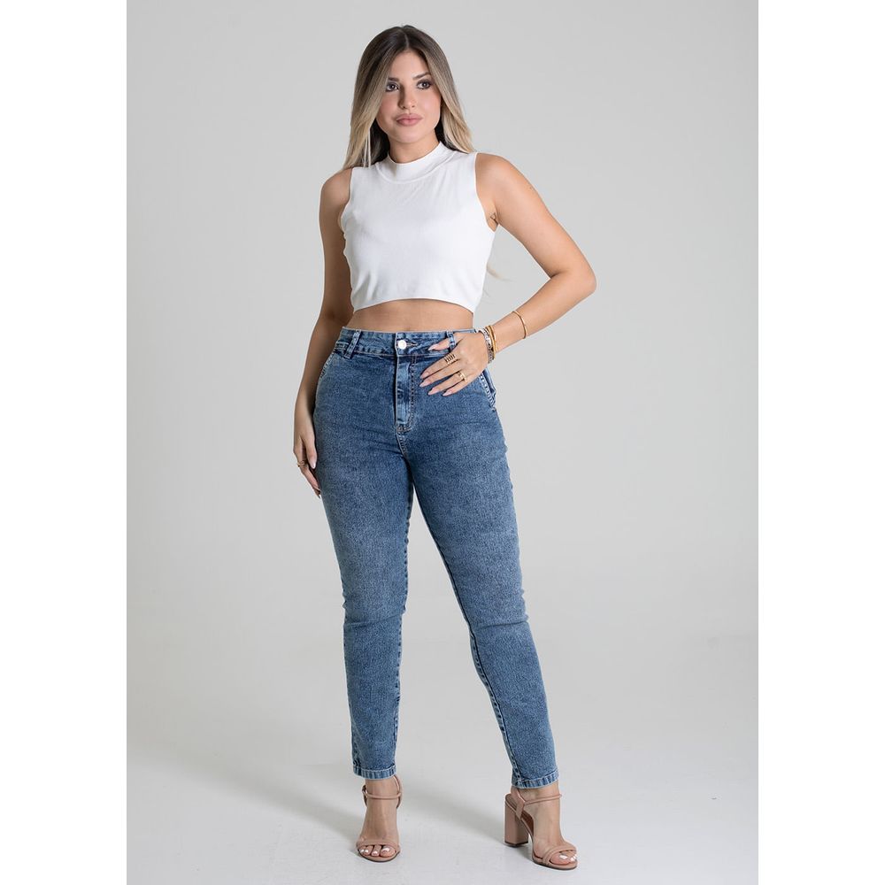 Calça jeans feminina de modelagem reta, com caimento mais solto ao corpo. Cintura alta Fechamento com botão e zíper Bolsos frontais falsos e bolsos traseiros funcionais Barra simples Tecido: Jeans Tipo de lavagem: Azul Cor: Azul médio