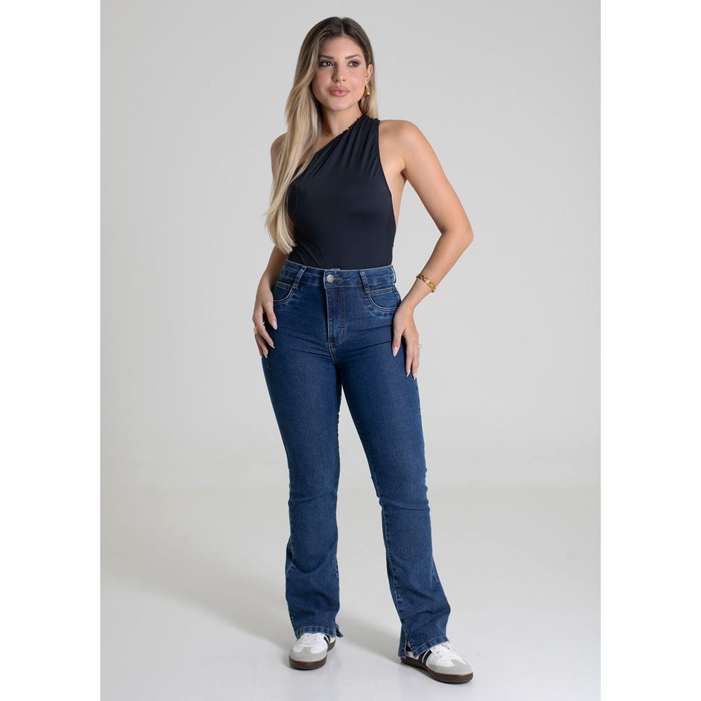 Calça jeans feminina de modelagem reta, com caimento mais solto ao corpo. Cintura alta Fechamento com botão e zíper Bolsos frontais falsos e bolsos traseiros funcionais Barra fenda lateral Tecido: Jeans Tipo de lavagem: Azul Cor: Azul médio