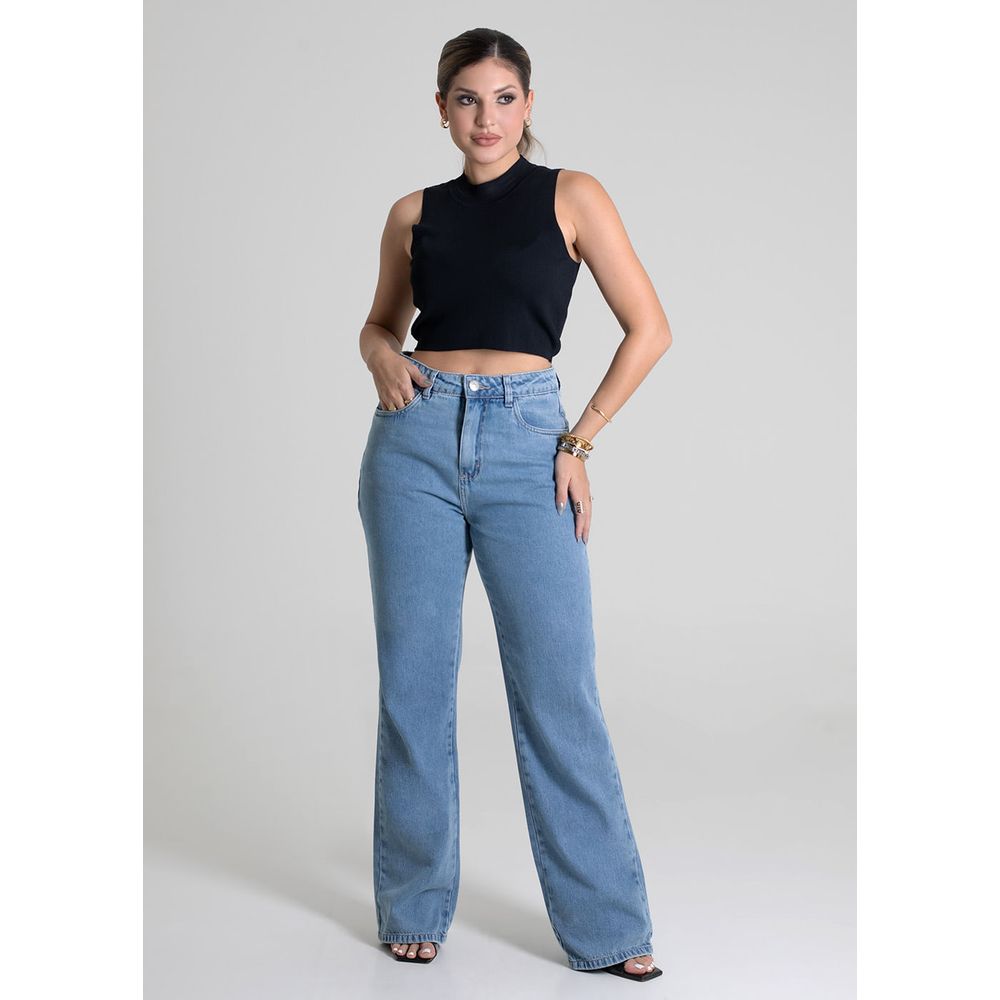 Calça jeans feminina de modelagem reta, com caimento mais solto ao corpo. Cintura média Fechamento com botão e zíper Bolsos frontais e bolsos traseiros funcionais Barra com fenda desfiada Tecido: Jeans Tipo de lavagem: Azul Cor: Azul