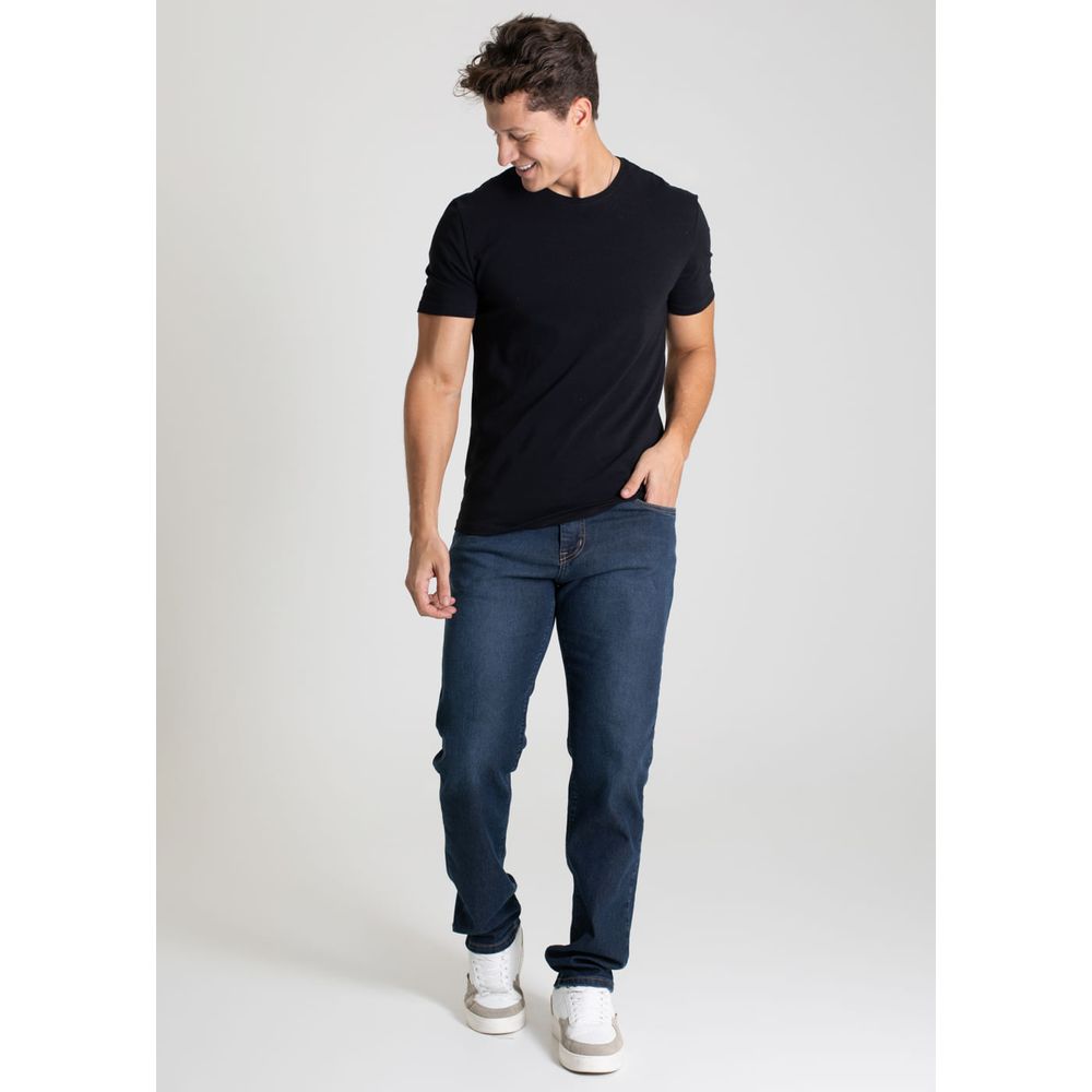 Calça reta confeccionada em jeans. Modelagem tem o caimento reto. Cintura média Fechamento com botão metálico e zíper Bolsos frontais e bolsos protetores Barra simples Modelagem: Reta Tecido: Jeans Tipo de lavagem: Azul Cor: Azul médio