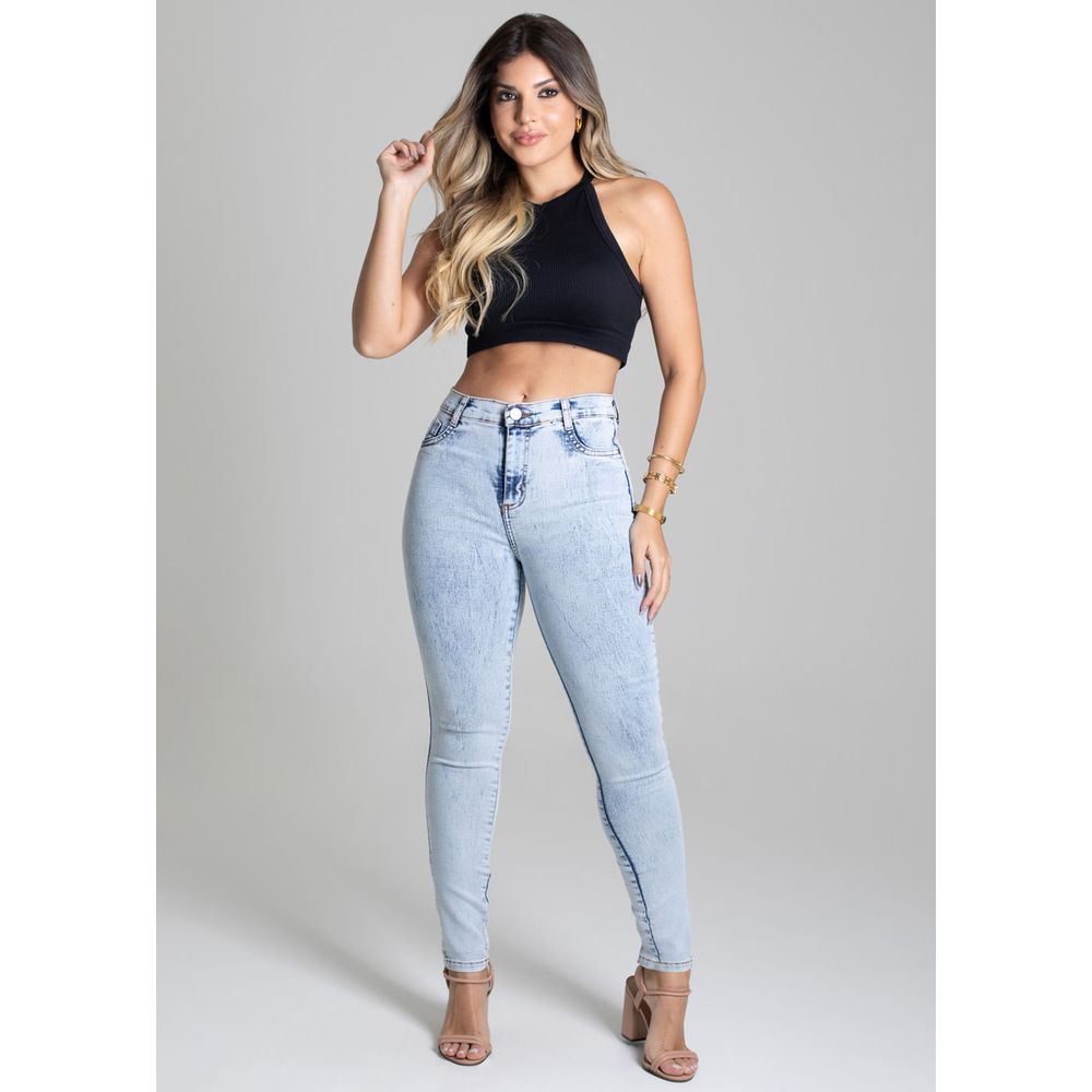 Calça feminina jeans skinny. A modelagem é skinny com caimento super ajustado ao corpo. Cintura média Fechamento com botão e zíper Bolsos frontais falsos e bolsos traseiros funcionais Barra simples Modelagem: Skinny Tecido: Jeans Tipo de lavagem: Azul Cor: Azul claro