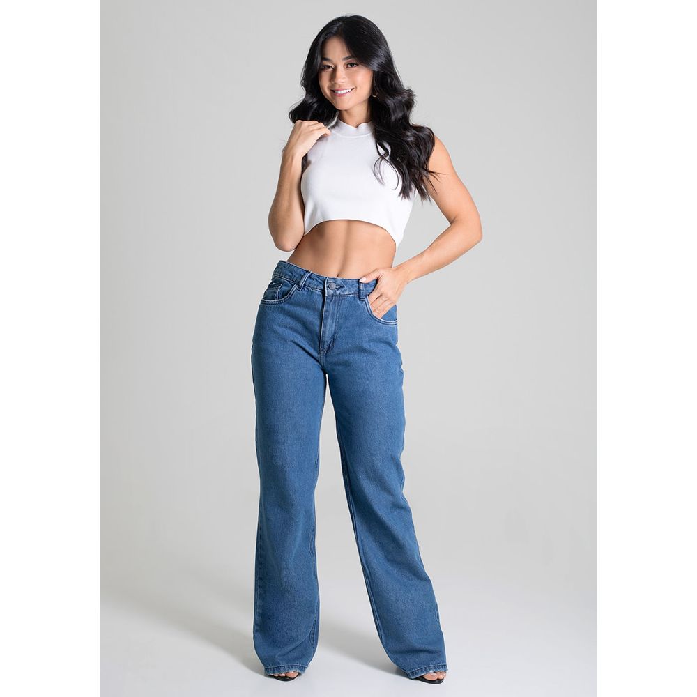 Calça feminina confeccionada em jeans. O modelo pantalona possui cintura alta, gancho no lugar e caimento amplo da coxa até a barra. Cintura alta Bolsos frontais e posteriores funcionais Barra simples Tecido: Jeans Tipo de Lavagem: Azul Cor: Azul médio