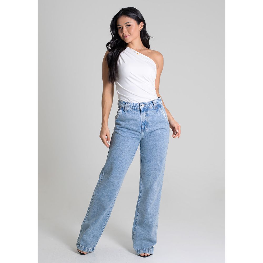 Calça feminina confeccionada em jeans. O modelo possui cintura super alta, gancho no lugar e caimento amplo da coxa até a barra. Cintura alta Fechamento através de um botão e zíper Bolsos frontais com leves puídos e posteriores funcionais Barra simples Tecido: Jeans Tipo de Lavagem: Azul Cor: Azul claro