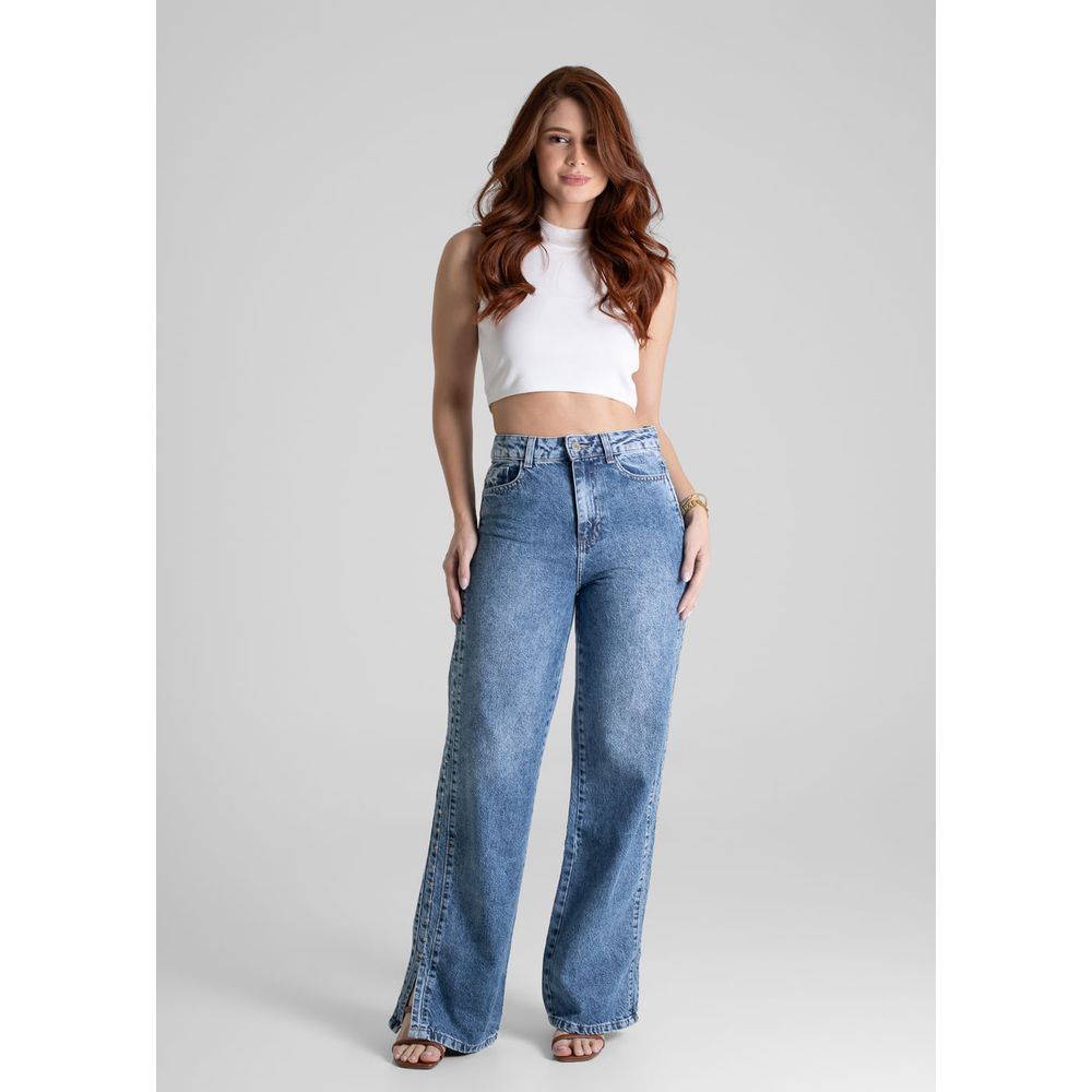 Calça feminina confeccionada em jeans. O modelo possui cintura super alta, gancho no lugar e caimento amplo da coxa até a barra. Cintura alta Fechamento através de um botão e zíper lados laterais acompanha stras ,Bolsos frontais e posteriores funcionais Barra simples Tecido: Jeans Tipo de Lavagem: Azul Cor: Azul medio
