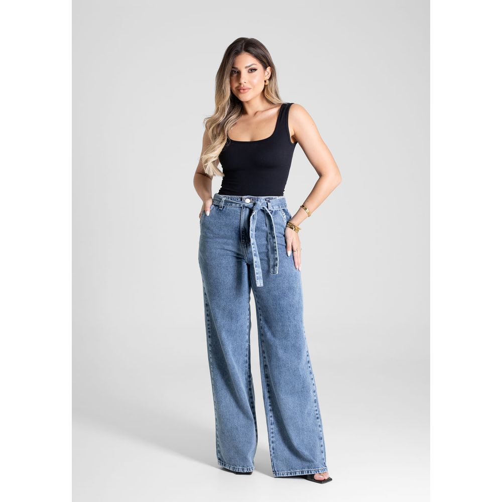 Calça feminina confeccionada em jeans. O modelo possui cintura super alta, gancho no lugar e caimento amplo da coxa até a barra. Cintura alta Fechamento através de um botão e zíper.cós acompanha um cordão com o mesmo tecido para amarração Bolsos frontais e posteriores funcionais Barra simples Tecido: Jeans Tipo de Lavagem: azul Cor: Azul médio