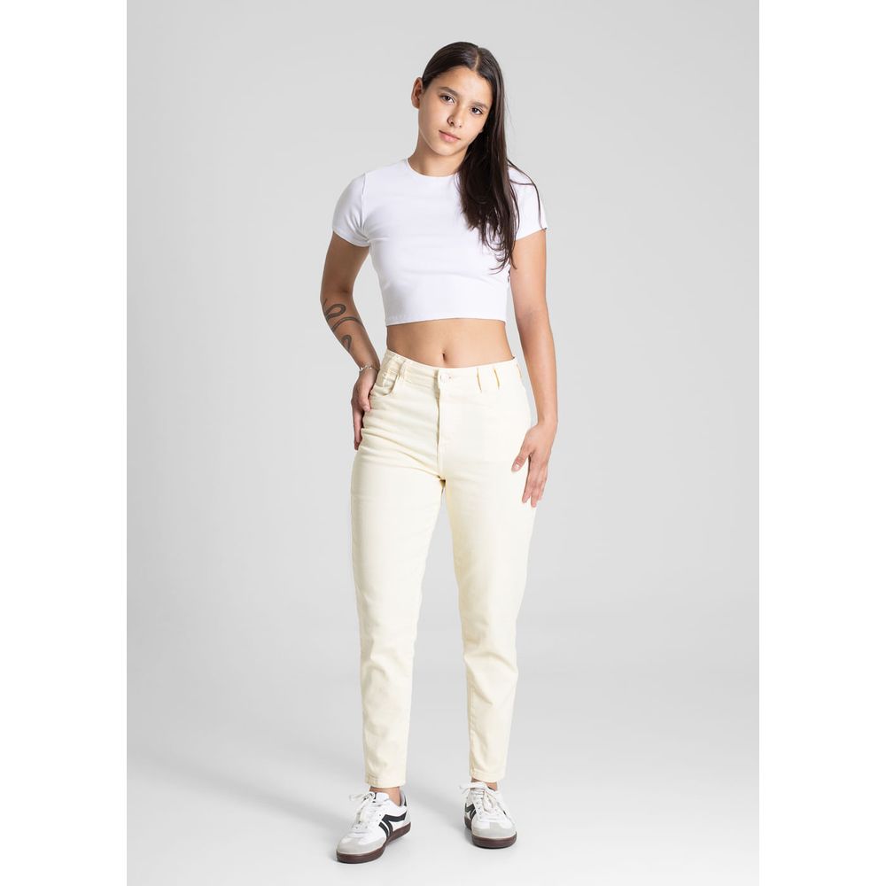 Calça mom confeccionada em sarja. A modelagem mom tem um caimento soltinho nos quadris e coxas ajustando até o tornozelo. Cintura alta Fechamento com botão e zíper Bolsos frontais e bolsos traseiros funcionais Barra simples Modelagem: Mom Tecido: Sarja Tipo de lavagem: Color Cor: amarelo