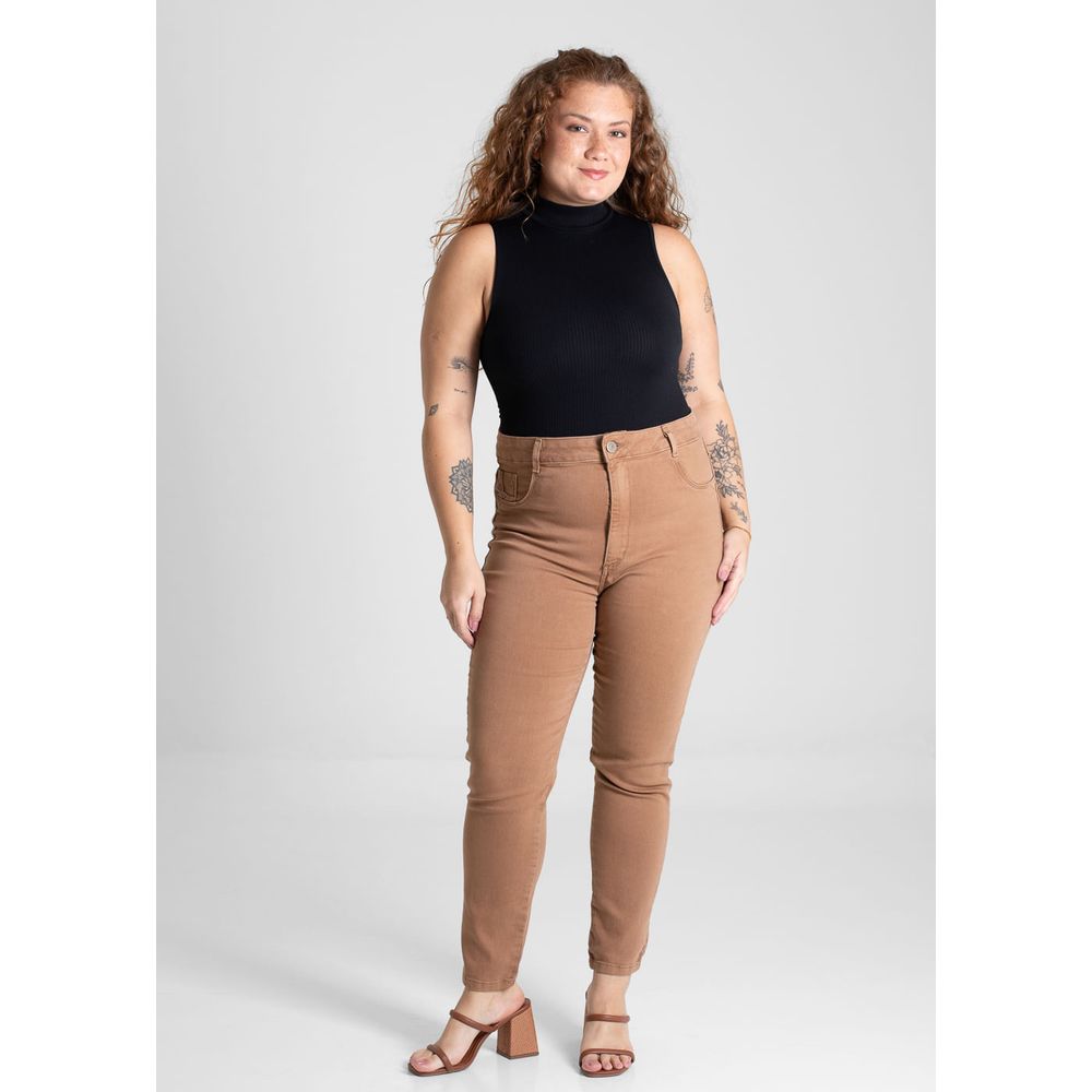 Calça plus size confeccionada em sarja. A modelagem tem quatro pences que valorizam as formas. Cintura médio Fechamento com botão metálico e zíper Bolsos frontais falsos e bolsos traseiros funcionais Barra simples Tecido: sarja Tipo de lavagem: color Cor: marrom