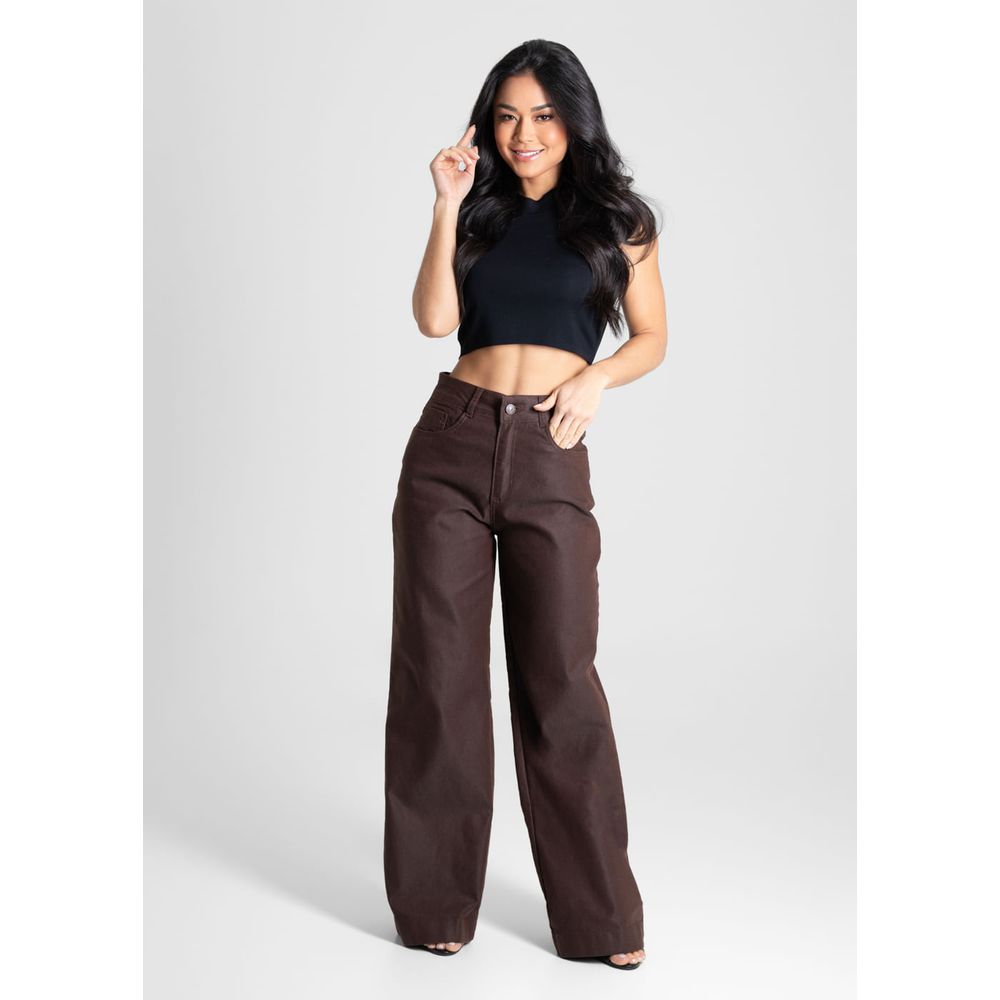 Calça feminina confeccionada em sarja. O modelo possui cintura super alta, gancho no lugar e caimento amplo da coxa até a barra. Cintura alta Fechamento através de um botão e zíper Bolsos frontais e posteriores funcionais Barra simples Tecido: Sarja Tipo de Lavagem: Color Cor: Marrom