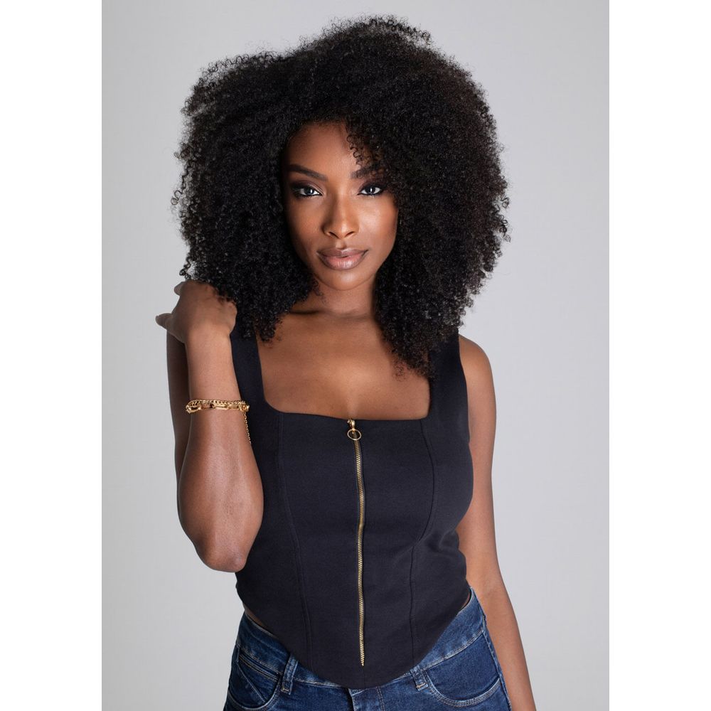 Cropped sawary caimento ajustado e comprimento curto. decote reto, fechamento frontal por zíper.