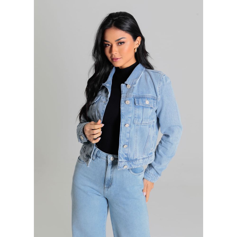 Detalhes Jaqueta confeccionada em jeans. Modelagem versátil e atemporal Comprimento curto Fechamento com botão metálico Dois bolsos frontais funcionais Modelagem: Jaqueta Tecido: Jeans Tipo de lavagem: Azul Cor: Azul médio