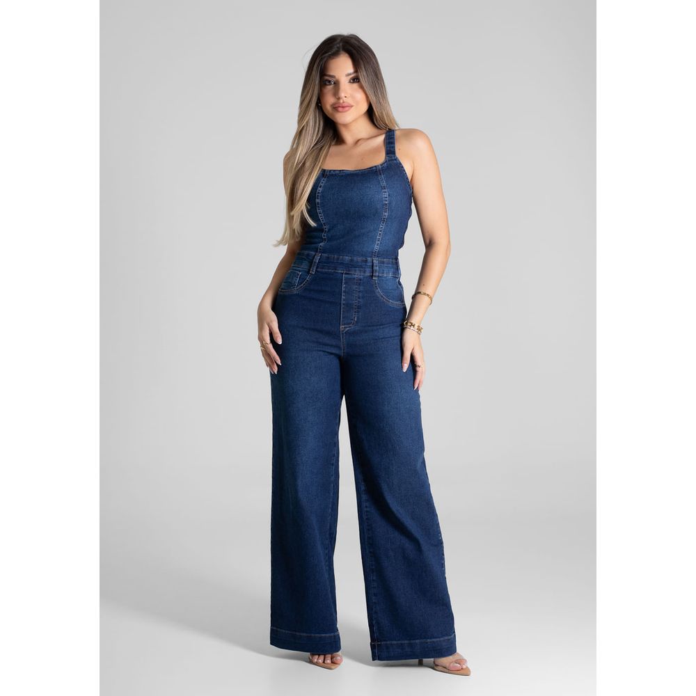 Macacão feminino confeccionado em jeans, proporcionando maior conforto e flexibilidade. O detalhe está na modelagem wide leg com corte diferenciado. Bolsos frontais falsos e traseiros funcionais Barra simples Tecido: Jeans Tipo de Lavagem: Azul Cor: Azul médio