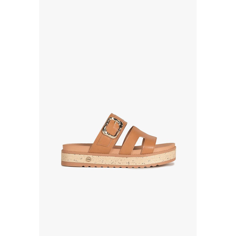 A Papete Dakota Adrienne possui design sofisticado e moderno. Possui duas tiras horizontais na parte superior, uma delas com uma fivela grande, que proporciona um detalhe de estilo e permite ajustar melhor ao pé. O solado é de plataforma, com acabamento que lembra cortiça, garantindo maior conforto e um visual descontraído. Além disso, o solado conta com pequenas partículas decorativas, dando um toque único ao design.