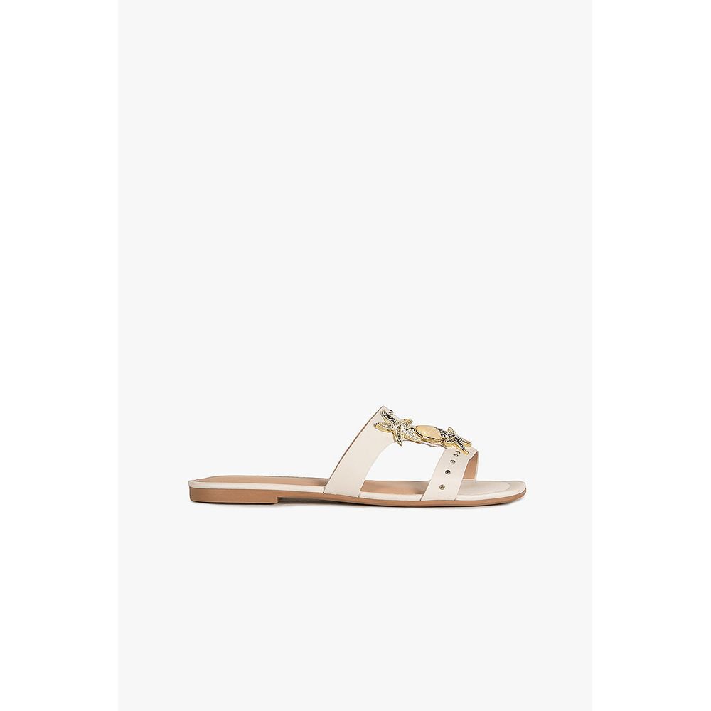 Rasteira Femimina Dakota Primula é uma rasteira de modelo slide, com tira larga na parte superior do pé. O destaque fica por conta dos enfeites metálicos aplicados sobre a tira, em formato de elementos marinhos, que adicionam um toque sofisticado e temático ao design. Possui solado baixo e levemente acolchoado, proporcionando conforto e praticidade para o uso cotidiano. Ideal para compor produções leves e elegantes.