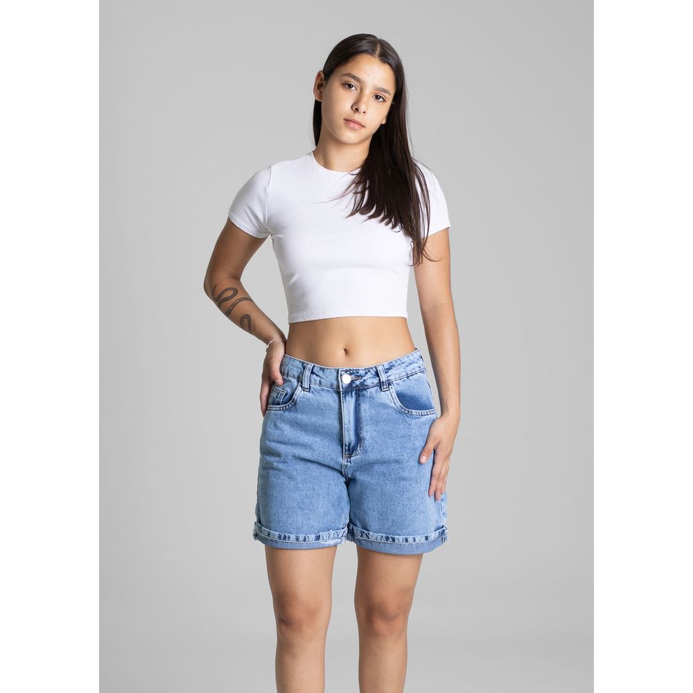 Shorts confeccionada em jeans. Modelagem soltinho. Cintura média Fechamento com botão e zíper Bolsos frontais e bolsos traseiros funcionais bolsos laterais cargo Barra dobrada Tecido: Jeans Tipo de lavagem: Azul Cor: Azul