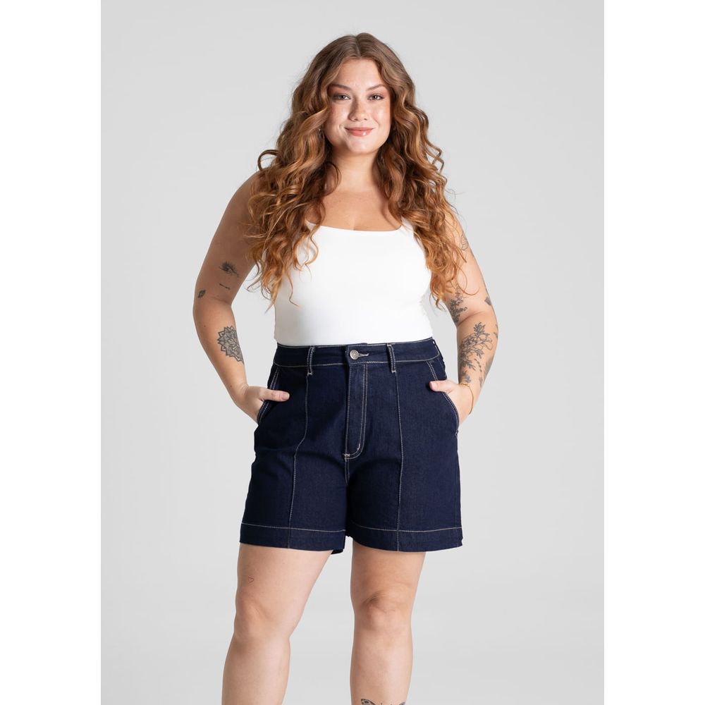 Shorts plus size confeccionado em jeans. Modelagem moderna e confortável para todas as ocasiões. Cintura alta  Fechamento com botão metálico e zíper Bolsos frontais e bolsos traseiros funcionais Barra simples Modelagem: Plus size Tecido: jeans Tipo de lavagem: azul Cor: azul medio