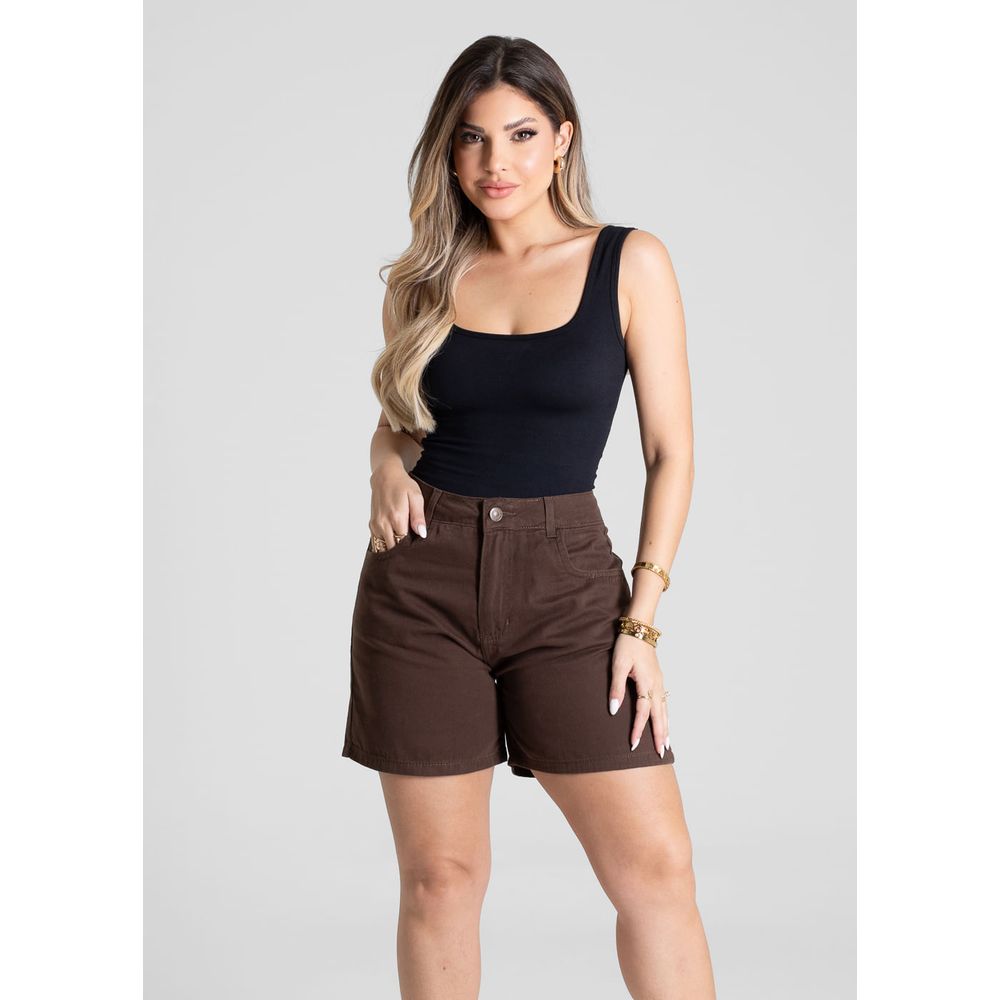 Shorts confeccionada em sarja. Modelagem soltinho. Cintura média Fechamento com botão e zíper Bolsos frontais e bolsos traseiros funcionais Barra simples Tecido: Sarja Tipo de lavagem: Color Cor: marrom
