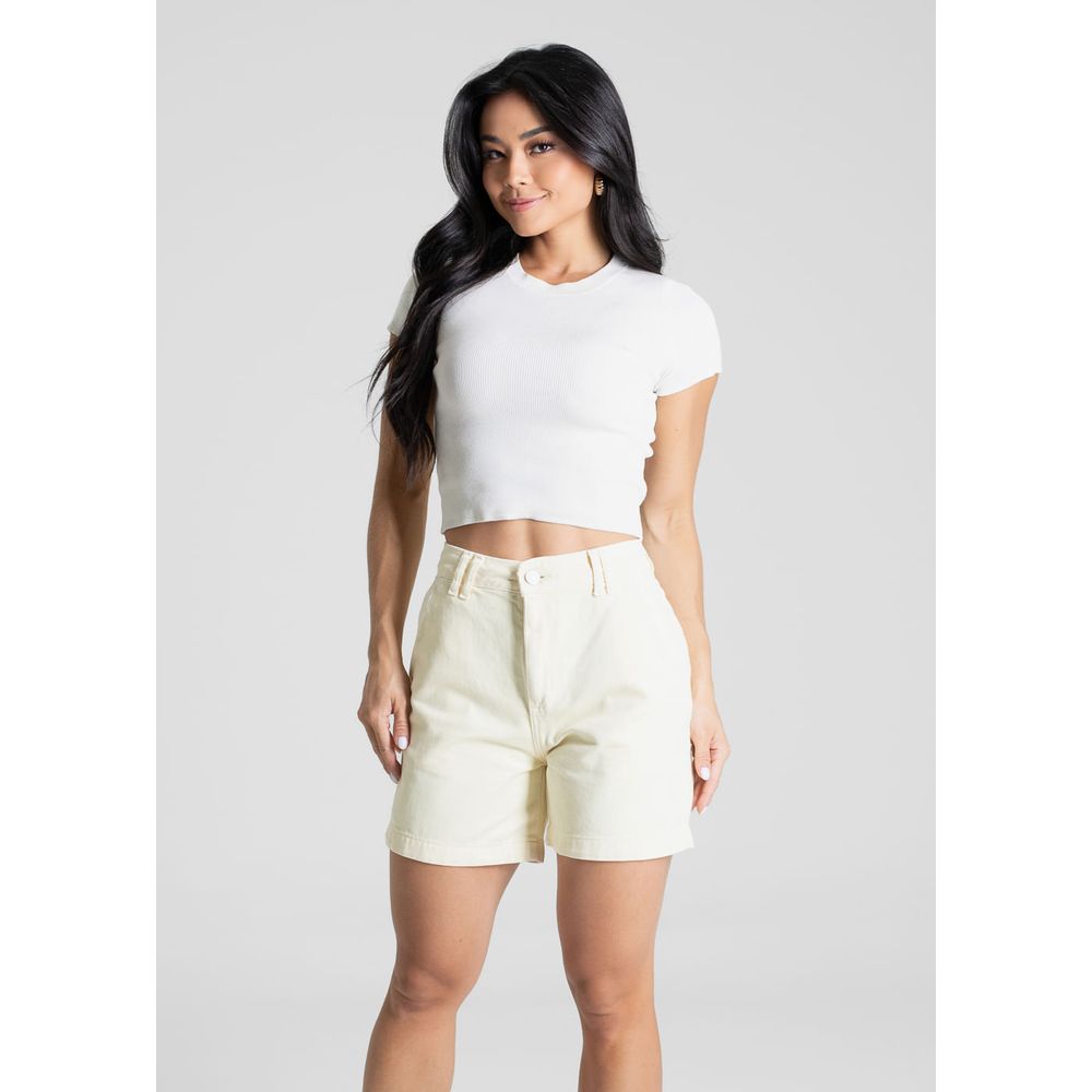 Shorts confeccionada em sarja. Modelagem soltinho. Cintura média Fechamento com botão e zíper Bolsos frontais e bolsos traseiros funcionais Barra simples Tecido: Sarja Tipo de lavagem: Color Cor: amarelo