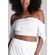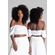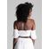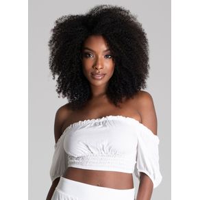O modelo é cropped com comprimento curto e caimento levemente ajustado com elástico embutido na barra e decote.